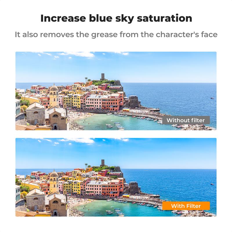 【Enhance Color & Contrast】CPL filter can enhance the color and contrast, and remove non-metallic reflections such as water, and glass to show the true color, especially used in white cloud and blue sky photography.